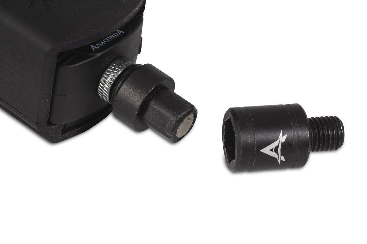 Wer seine Bissanzeiger oder Bank Watcher zum sicheren Transport abnehmen möchte, wird auf die Magnet-Adapter nicht verzichten können. Blitzschnell kann der Bissanzeiger aus dem im Buzzer Bar oder Bank Stick verschraubten Teil herausgezogen werden. Der Kopf des Connectors, mit seiner Seckskant-Steckverbindung, wird einfach in das untere Teil eingesteckt und durch einen starken Magneten gesichert.