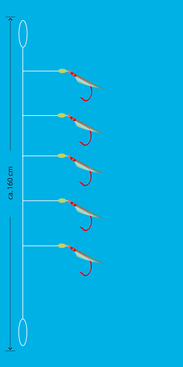 Heringsvorfach mit 5 Red Hooks und Fischhautimitat.