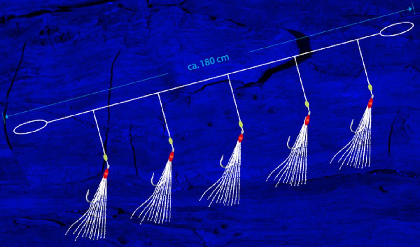 Starkes Makrelen- und Pilkvorfach mit 5 Cristal Haken, Fluolockperlen und weissen Federn mit Tinsel. Inkl. EVA-Board