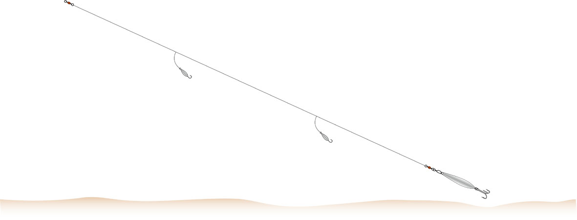 Dieses System hat sich besonders im Sommer auf große Makrelen und Seelachse bewährt. Fischen Sie aktiv in verschiedenen Wassertiefen, bis der Schwarm gefunden ist.