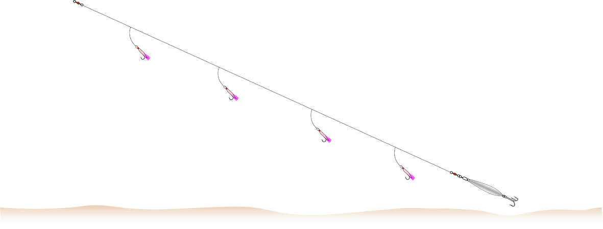 Sehr fängiges System für Köhler und Pollacks. Fischen Sie in verschiedenen Wassertiefen, bis Sie den Standort der Köhler ausgemacht haben.