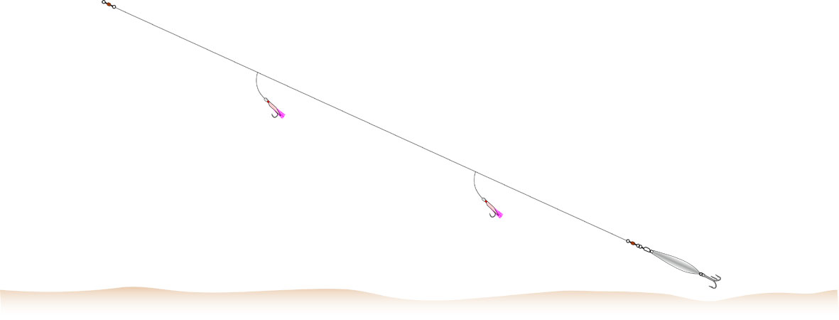 Sehr fängiges System für Köhler und Pollacks. Fischen Sie in verschiedenen Wassertiefen, bis Sie den Standort der Köhler ausgemacht haben.