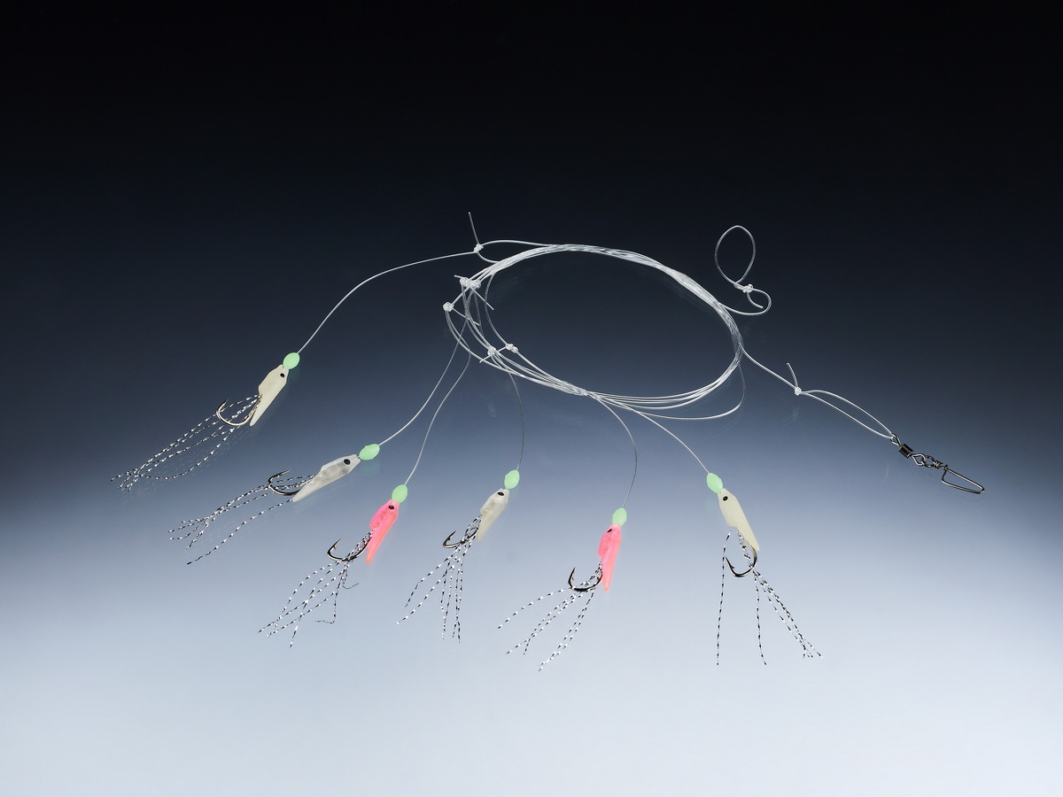 Sehr fängige Makrelensysteme. Alle Vorfächer sind mit Wirbeln ausgestattet, in die Sie Pilker oder Blei einhängen können.