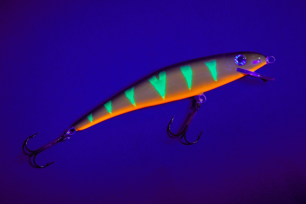 Matze´s UV Booster. „UV aktiv“ lautet mittlerweile das Schlüsselwort für mehr Fangerfolg beim Kunstköderangeln. Speziell in trübem Wasser, an trüben Tagen sowie in der Dämmerung und nachts wirken die UV aktiven Farben wie ein Restlichtverstärker auf die Fische. Man muss sich das so vorstellen: In der Dämmerung sind graue Katzen schwer auszumachen, während eine weiße Katze klar hervorsticht, ohne unnatürlich zu wirken. Wäre sie mit einem Licht bestückt, würde sie zwar auffallen, aber völlig unnatürlich aussehen. Und genau so ist auch mit UV-aktiven Wobblern; sie stechen bei o.g. Lichtverhältnissen raus ohne Misstrauen zu erwecken. Neben den grellen UV Farben gibt es auch die „UV Confidential“ Typen mit natürlichen Farben und unsichtbarem UV Lack. Erst wenn sie mit Schwarzlicht angeleuchtet werden sieht man eindrucksvoll den UV Lack. Neben dem Shallow Runner gibt es den Medium Runner, der die Lücke zwischen Deep Runner (Tiefläufer) und Shallow Runner (Flachläufer) schließt.