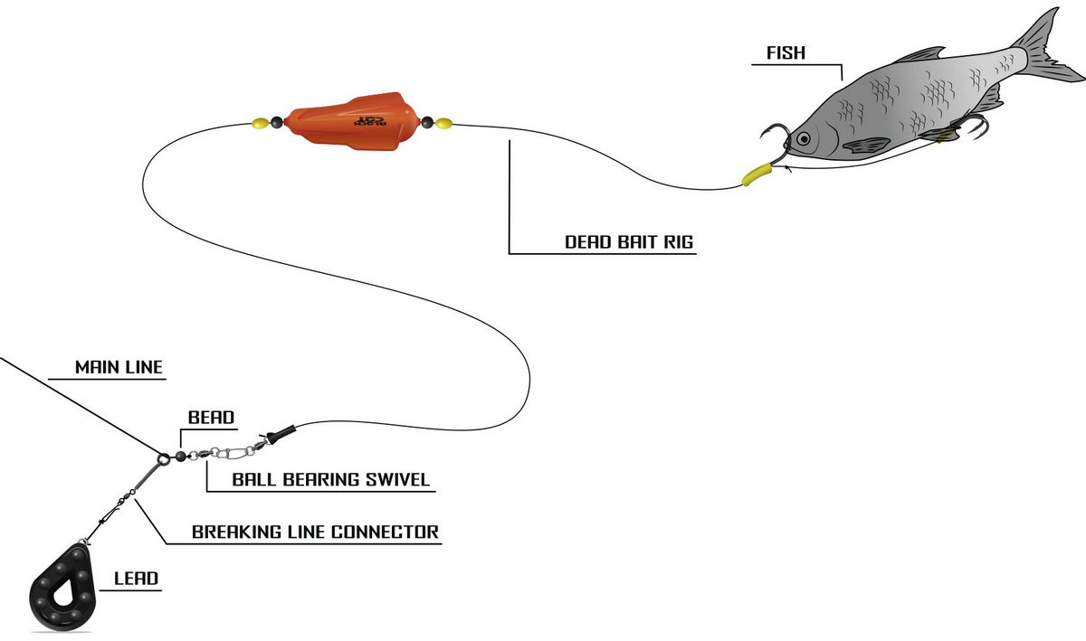 Waller Spezial Fertigvorfach von Stefan Seuß. Das Dead Bait Rig eignet sich hervorragend für die Präsentation von toten Köderfischen in fließenden Gewässern knapp über Grund. Eine X-Strong Flügel U-Pose ist auf dem Vorfach direkt vor dem Köder montiert und erzeugt in der Strömung durch rotierende Bewegung eine lockende Wasserverwirbelung direkt vor dem toten Köderfisch. Der Köderfisch wird im vorderen Kopfbereich am Einzelhaken fixiert und im hinteren Schwanzbereich mit dem Double Ghost Hook.