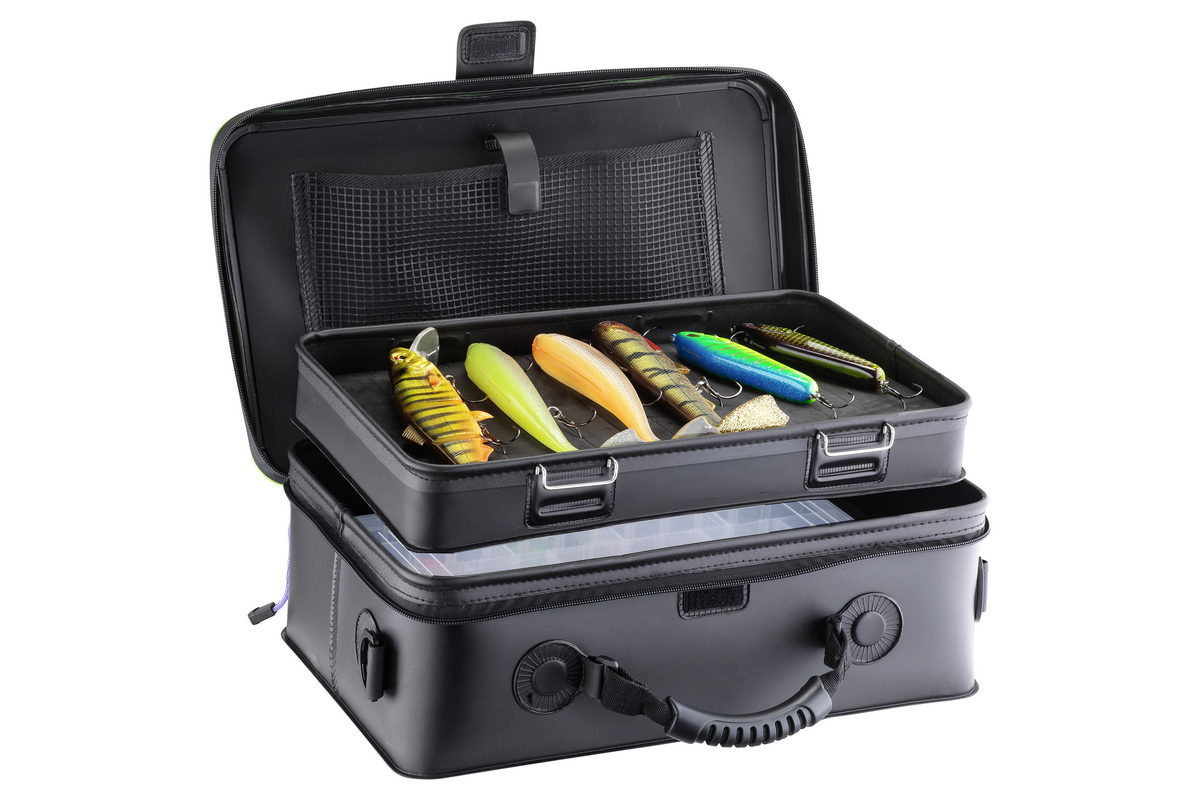 Das obere Abteil kann komplett herausgenommen werden – im Hauptabteil darunter findet eine große, bis zu 10cm hohe XL Tackle Box, sowie kleines Zubehör problemlos Platz. Das obere Abteil ist mit einem dicken EVA Board ausgestattet, in das bis zu 16 voll montierte Köder bis ca. 28cm Länge eingesteckt werden können – somit kann man bereits im Voraus die Köder, die am Angeltag gefischt werden sollen, griffbereit und sicher zusammenstellen. Dieses Abteil besitzt zwei Bänder mit Klettverschluss am hinteren Ende – damit kann das Abteil sogar an der Bootsreling montiert werden, um die benötigten Köder sofort griffbereit zu haben. Eine Netztasche im Deckel bietet Platz für Dokumente, Schlüssel, etc.