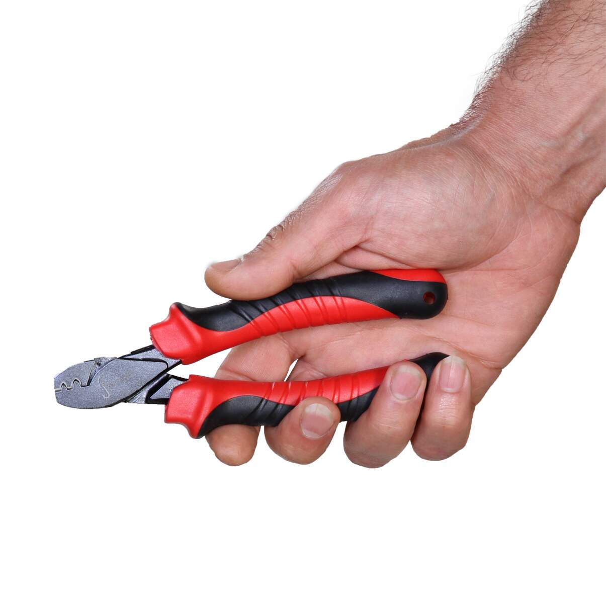 Qualitativ hochwertige Klemmhülsenzange mit zwei Kammern, um unterschiedlich große Quetschhülsen optimal zu klemmen. Gesenkgeschmiedeter Kohlenstoffstahl mit teflonbeschichteten Backen. Ergonomisch geformte rutschfeste Griffhülle sorgt für sicheren Halt. Die Teflon Beschichtung reduziert die Gefahr von Korrosion.