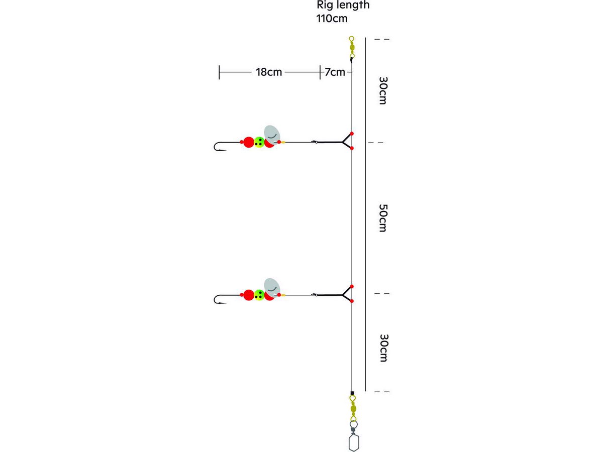 Dieses leichte Boots- und Küstenangel-Vorfach wird mit zwei gedrehten Drahtseitenarmen und schwimmenden Perlen hergestellt, um jegliche Probleme zu vermeiden. Spinnerblätter ziehen Fische von weit her an.