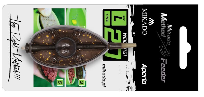 Aperio ist ein neuartiger Futterkorb für das Angeln mit dem Method Feeder, der vollständig vom Mikado-Testerteam entworfen und gefertigt wurde. Sowohl die Form als auch der Aufbau wurden von uns beim EUIPO eingetragen. Bei der Entwicklung von APERIO verfolgten wir das vorrangige Ziel: wir wollten ein maximal bedienungsfreundliches Futterkörbchen schaffen, das zugleich frei von allen Nachteilen der auf dem Markt erhältlichen Körbchen sein wird. Monatelange Versuche in verschiedenen Gewässern bestätigten uns in der Meinung, dass das Angeln mit offenem Korb viel mehr Bisse garantiert, als beim Rippenkorb. Gestützt auf diesen Schluss entwickelten wir mehrere Prototypen, die uns nach vielen Stunden am Wasser und nach zahlreichen Modifizierungen ermöglichten, das Modell APERIO zu präsentieren. Zu den grundsätzlichen Produkteigenschaften, die das problemlose und erfolgreiche Angeln mit dem APERIO-Körbchen sichern, gehören: Einfache Verlegung der Schnur und deren Schutz im Inneren des Korbs. Das im Inneren des Korbs eingearbeitete Röhrchen ermöglicht es, die Hauptschnur einfach zu verlegen und schützt sie vor Beschädigungen. Der Korb kann sowohl mit der Futterform als auch ohne benutzt werden. Die Öffnungen erleichtern den Wasseraustausch und sorgen für schnelleres Lösen des Futters. Die nach innen geneigten, erhöhten Wände verbessern die Haftung vom Futter im Korb bei weiten Würfen. Futterkorb für den Köder mit Haken Der mit dem Futterkorb APERIO geworfene Köder wird den Fischen sehr gut präsentiert, auch wenn das Futter sich vom Korb vollständig löst.