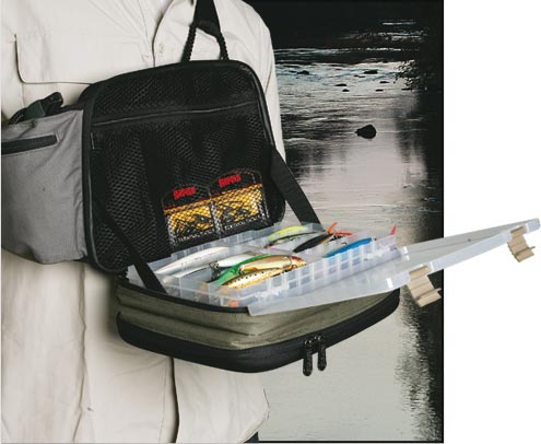 Revolutionäre Tasche für den mobilen Fischer. Man hängt sich die Tasche um, die wichtigsten Fächer öffnen sich wie ein Tablett nach vorne, mit gegebenenfalls innen liegenden Tackle-Boxen der Größe 3600, die hier Platz finden. Es gibt zwei große Fächer-Abteilungen mit Doppel-Reißverschluss. Auf dem gepolsterten Schulterriemen befinden sich ein D-Ring, eine Tasche mit Reißverschluss an Vorder- und Rückseite sowie ein Zangen-Halter.