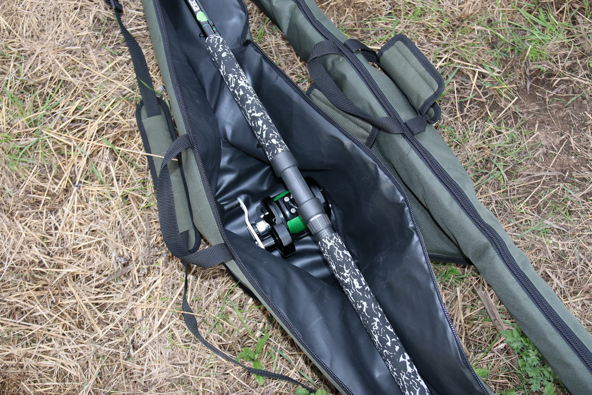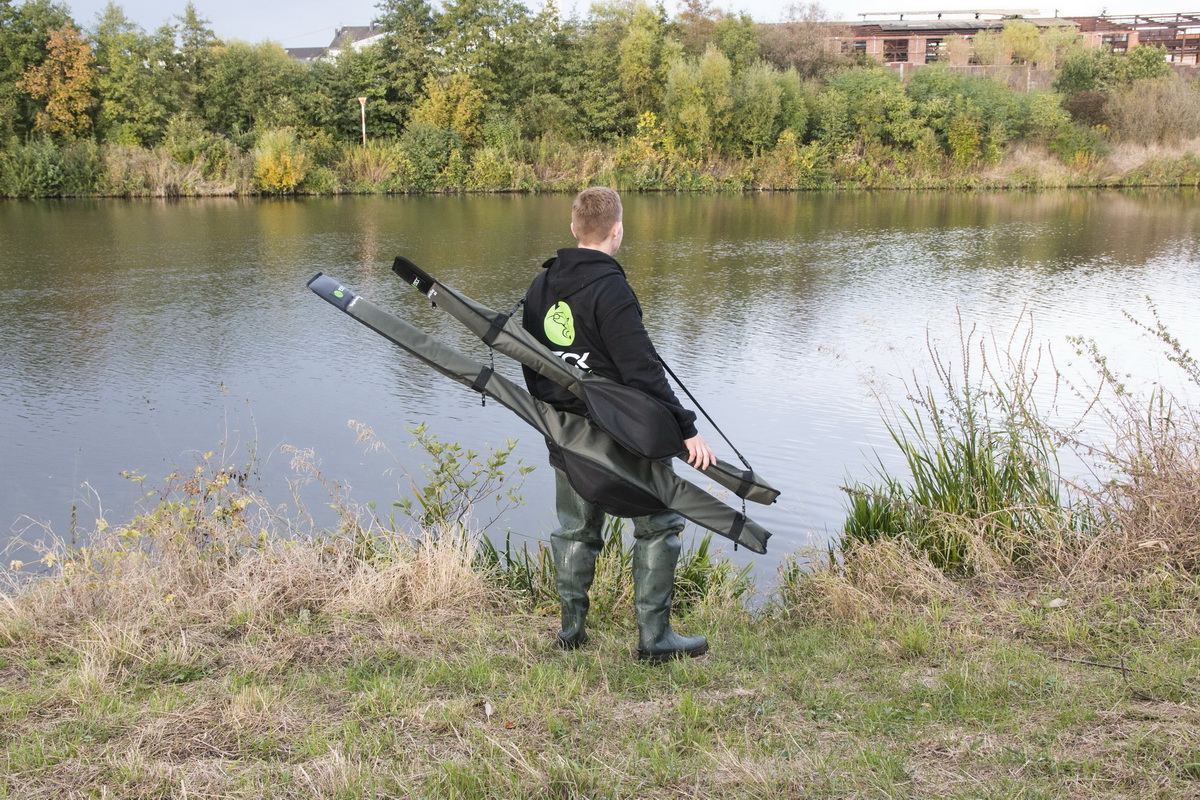 Bei diesem Einzelfutteral wurde der groß dimensionierte Bereich, in dem die Rolle Platz findet, speziell an die Griffergonomie von Welsruten angepasst. Das obere Ende wurde nochmals verstärkt, um die Rutenspitze zu schonen. Der gerade verlaufende oben liegende Reißverschluss ermöglicht ein einfaches Öffnen und Schließen. Zum Transport können die Single Rod Bags einfach aneinander geklippt werden, auch wenn diese unterschiedliche Längen haben. Neben dem Tragegriff befinden sich auch zwei Ösen zur Befestigung eines Schultergurtes (nicht im Lieferumfang enthalten) an der Taschenseite.